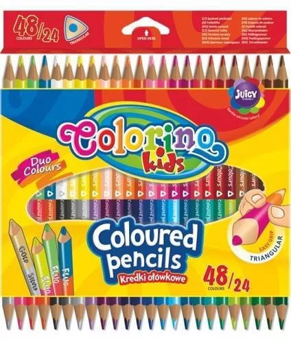 Colorino Kids trio 24 db-os, kétvégű színesceruza készlet. 24 ceruza 48 különböző színe között megtalálható arany, ezüst, és 3 db fluoreszkálós is, melyekkel csodás rajzok készíthetők. Háromszög kialakítása stabil fogást biztosít. Az erős ceruzabél anyagának köszönhetően könnyed rajzolást tesz lehetővé, erősen pigmentált színei tökéletes fedést nyújtanak a papíron. Könnyen hegyezhető, a ceruzabél színével megegyező színű ceruzatest.
