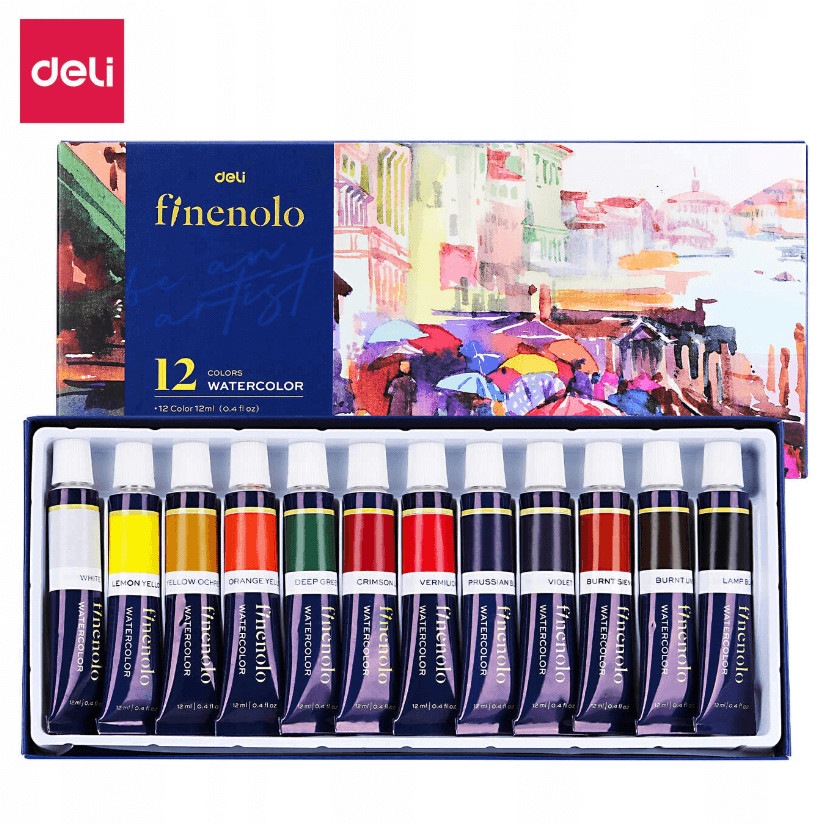 Professzionális 12 darabos vízfesték készlet DELI márkájú tubusokban, kényelmes dobozba csomagolva.