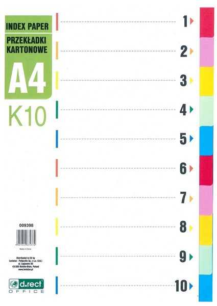 Praktikus megoldás az iratok jobb rendszerezésére, kikeresésére. Minőségi karton alapanyag. 11 lefűzőlyuk. 10 különböző színű széllel jelzett elválasztólap.