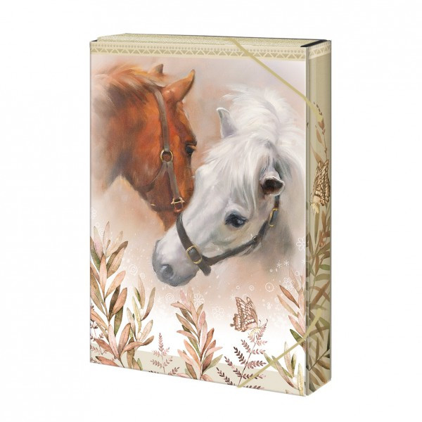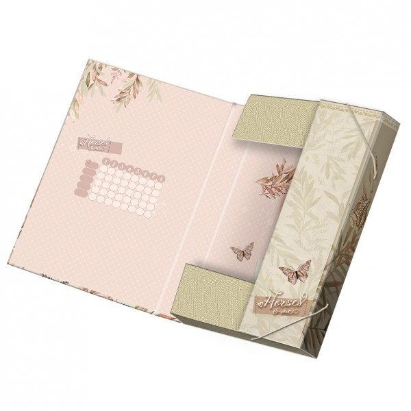 Kiváló minőségű kívül , belül nyomott karton gumis füzetboxok, különböző mintákkal. Belsejében órarend található. Mérete: 22,5 x 32 x 4,5 cm