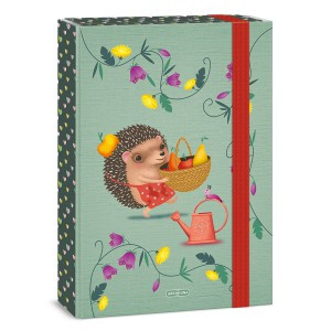 A/5 méretű füzetbox. Kemény, tartós kartonból, 4 cm-es gerinccel, fényes fóliával, 7 mm széles gumipánttal. Belseje egy színnel nyomott. Füzetek, iratok tárolására.