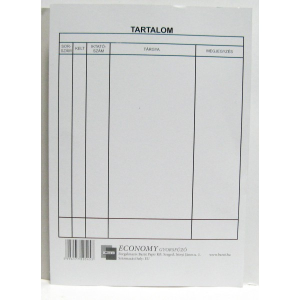Papír gyorsfűző, fém fűzőszállal. 150-200 lap lefűzésére alkalmas. 230 g/m2- es karton alapanyag. Táblázatos előlap.