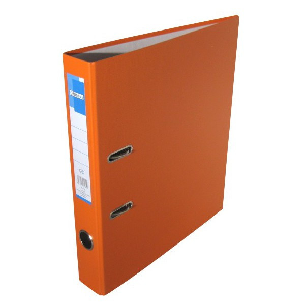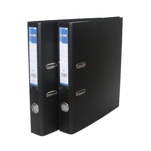Magyar gyártású emelőkaros iratrendező, kívül műanyag, belül papír bevonat, cserélhető címkével, kihúzólyukkal.