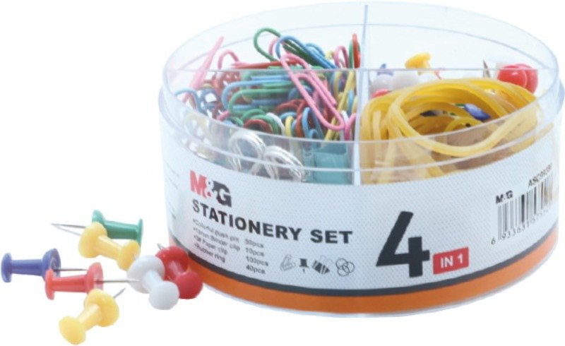 Praktikus, 4 db-os irodai szett. Ideális iskolai, irodai, illetve otthoni használatra. A szett tartalma: térképtű, színes gémkapocs, színes iratcsipesz, gumigyűrű.