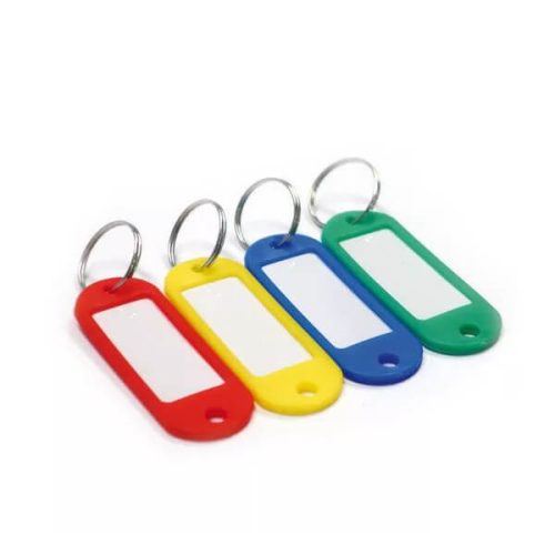Műanyagból készült, cserélhető azonosító címkével. Fém kulcskarikával, 50 db-os hengerben, vegyes, véletlenszerű színösszeállításban. Tartós minősége miatt alkalmas ruhatári feliratozáshoz, bőröndök címkézéséhez.