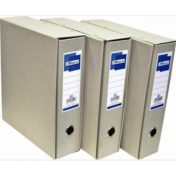 Natúr kartonból készült egyszerű kivitelű, emelőkaros szerkezettel ellátott tokos iratrendező, ragasztott címkével.